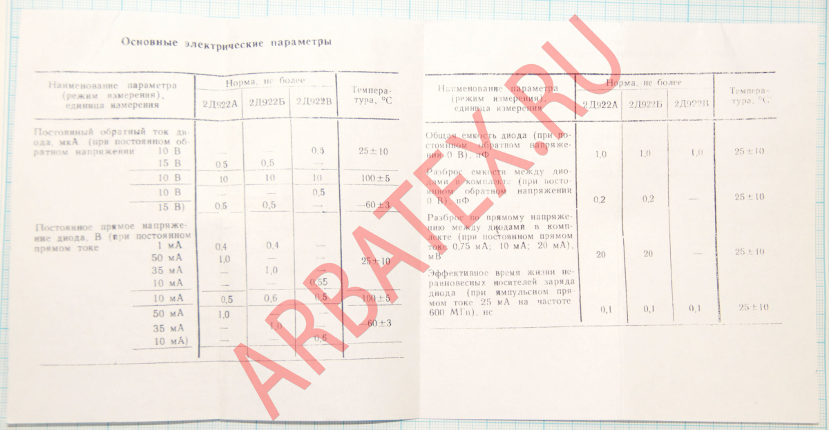 Для схем, требующих малого разброса параметров диодов, диоды 2Д922А, 2Д922Б, КД922А, КД922Б могут поставляться в комплекте из двух или четырех диодов, подобранных по прямому напряжению и общей емкости.