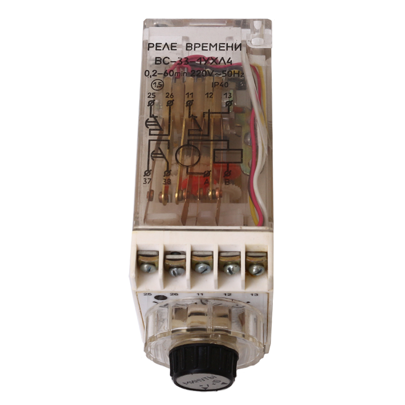 Реле времени ВС-33-1 0,2-60 сек. 24В выступающего исполнения с передним присоединением проводов применяется для получения независимой выдержки времени. Реле времени применяется в схемах, где необходимо автоматически выполнить какое-то действие через определенный промежуток времени. Реле электромеханическое, с приводом от синхронного электродвигателя. Механизм реле размещен в пластмассовом корпусе, на лицевой части реле выведен переключатель поддиапазона установок и ручка установки выдержки времени. В комплекте с реле может поставляться колодка для крепления реле.